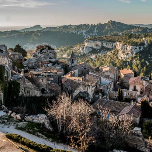 Monter en voiture à l’entrée du village des Baux, pour admirer la vue sur le sud des Alpilles, puis redescendre vers Maussane les Alpilles.